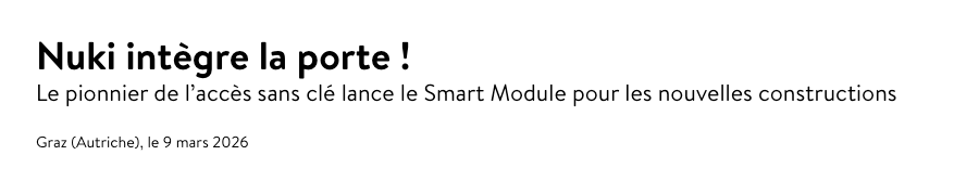 - «Un standard pérenne» : le Smart Module est présenté par Nuki comme une solution durable, pensée pour faire de l’accès intelligent un équipement de base des constructions neuves. [nuki](https://nuki.io/fr-gr/entreprise/communiques-de-presse/smart-module)